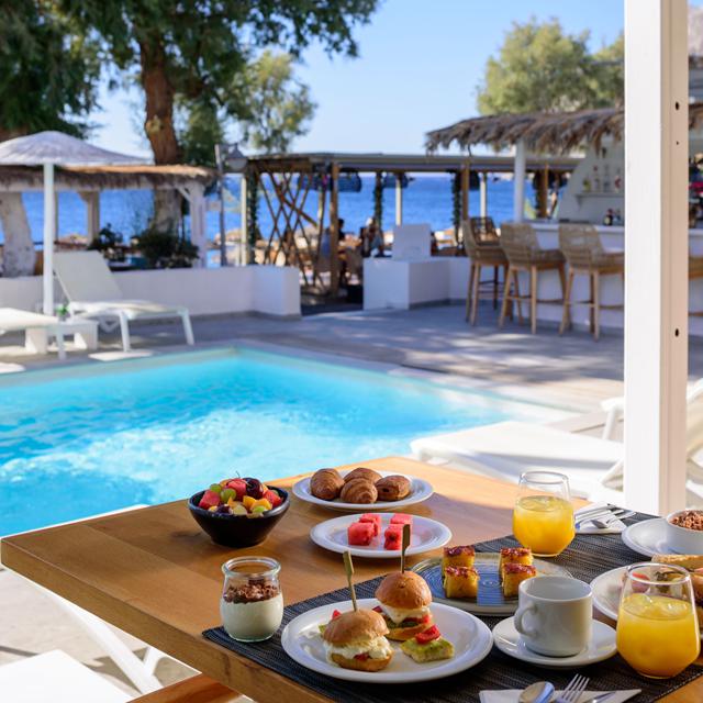 Het charmante Alesahne Beach Hotel ligt vrijwel direct aan het strand. En niet zomaar een strand, één van de bekende vulkanische zwarte stranden van Santorini. Hier kun je genieten van een privéstrand met gratis ligbedden waar je door personeel bediend wordt, hoe heerlijk is dat?